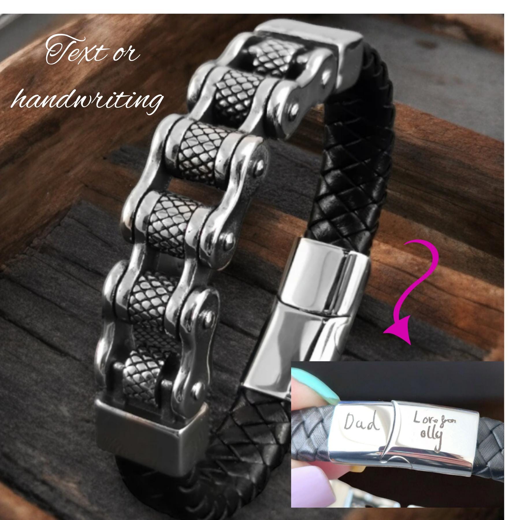 Upgrade your style with this rugged and masculine black leather bracelet, designed for motorcycle enthusiasts and trendsetters alike. Featuring a motorbike chain-inspired design, this bracelet perfectly blends durability with a sleek, modern edge.