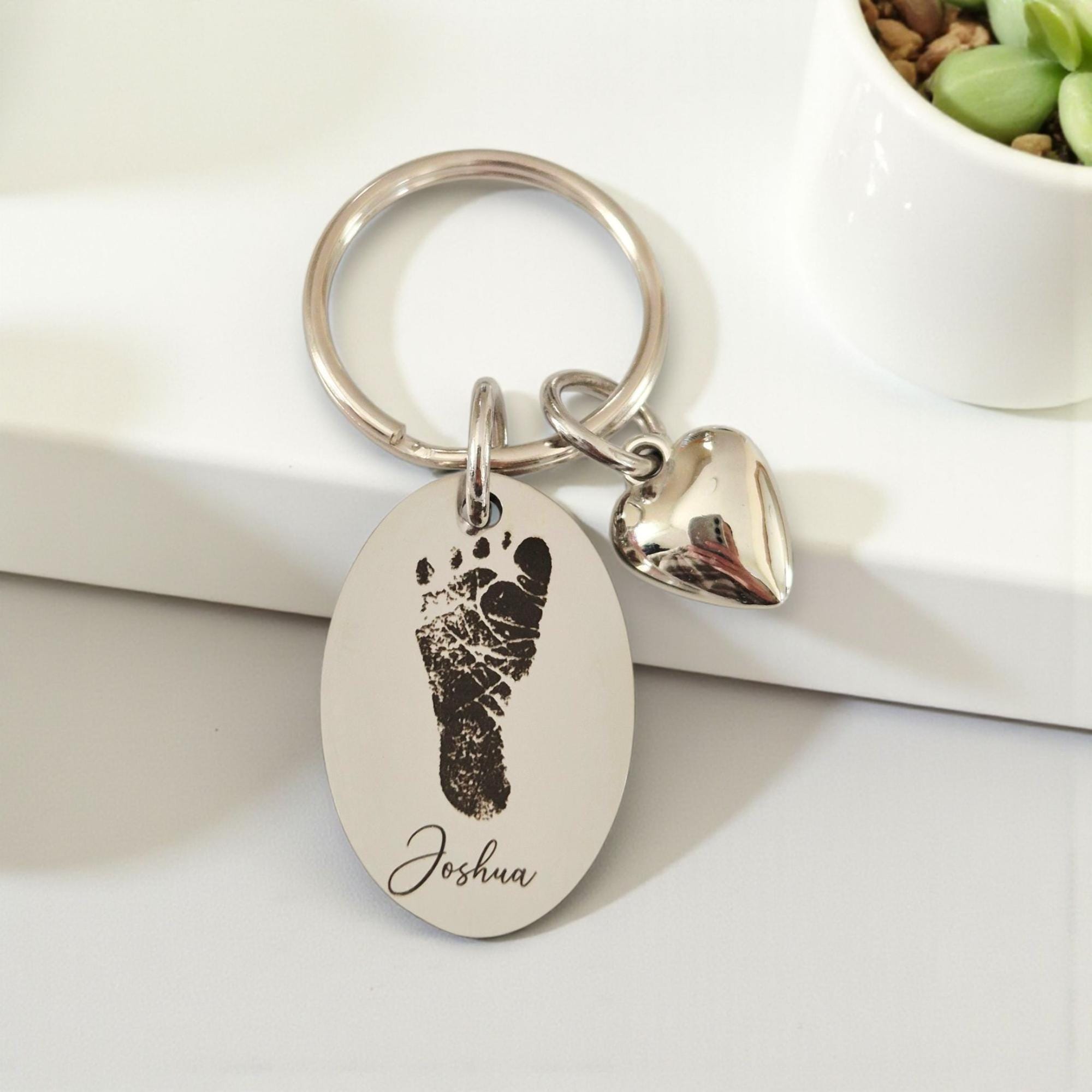 A beautiful way to keep their memory close — our 30x25mm stainless steel oval keyring can be engraved with your loved ones hand / foot / finger print, pets nose print, or photo, along with a name or short message.