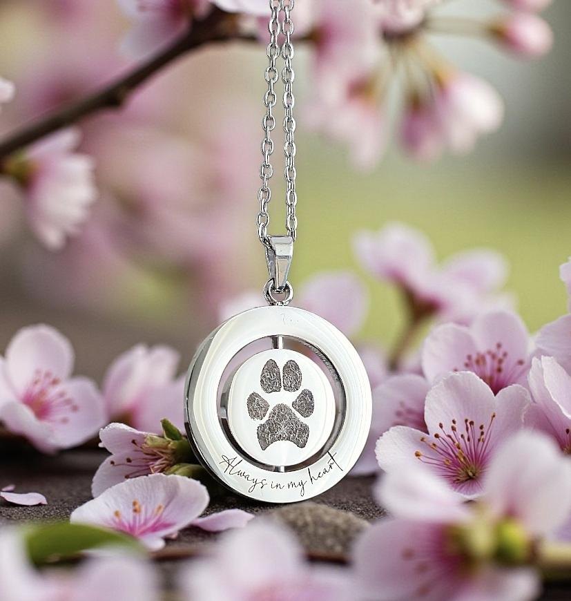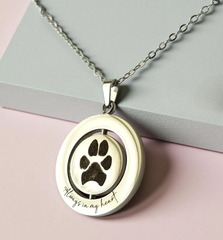 This 25mm stainless steel swivel necklace can be engraved with any image that means the world to you — a beloved photo, fingerprint, paw print, or even a handwritten note. The central pendant spins gently within the frame, revealing both sides for your chosen designs or text.