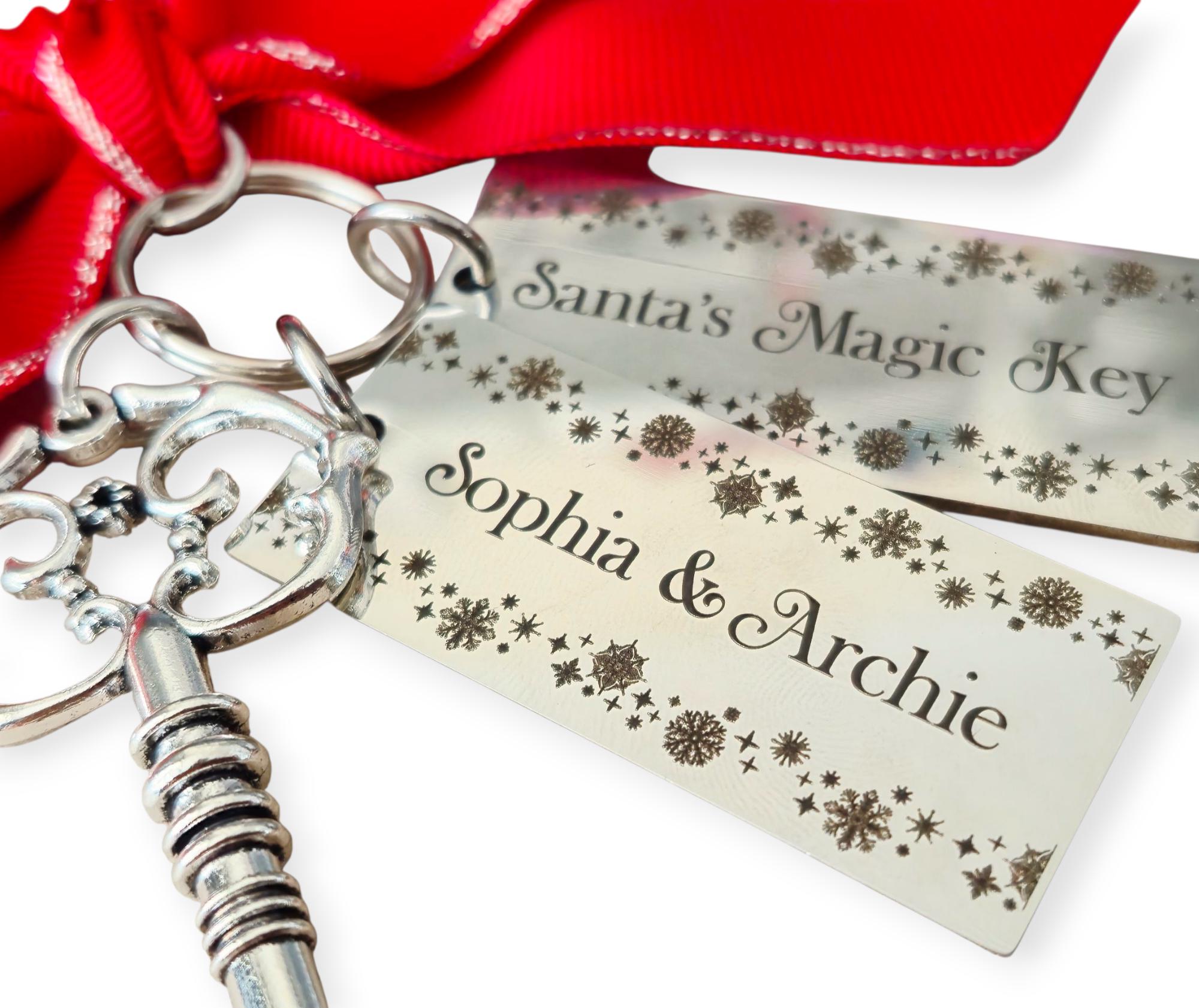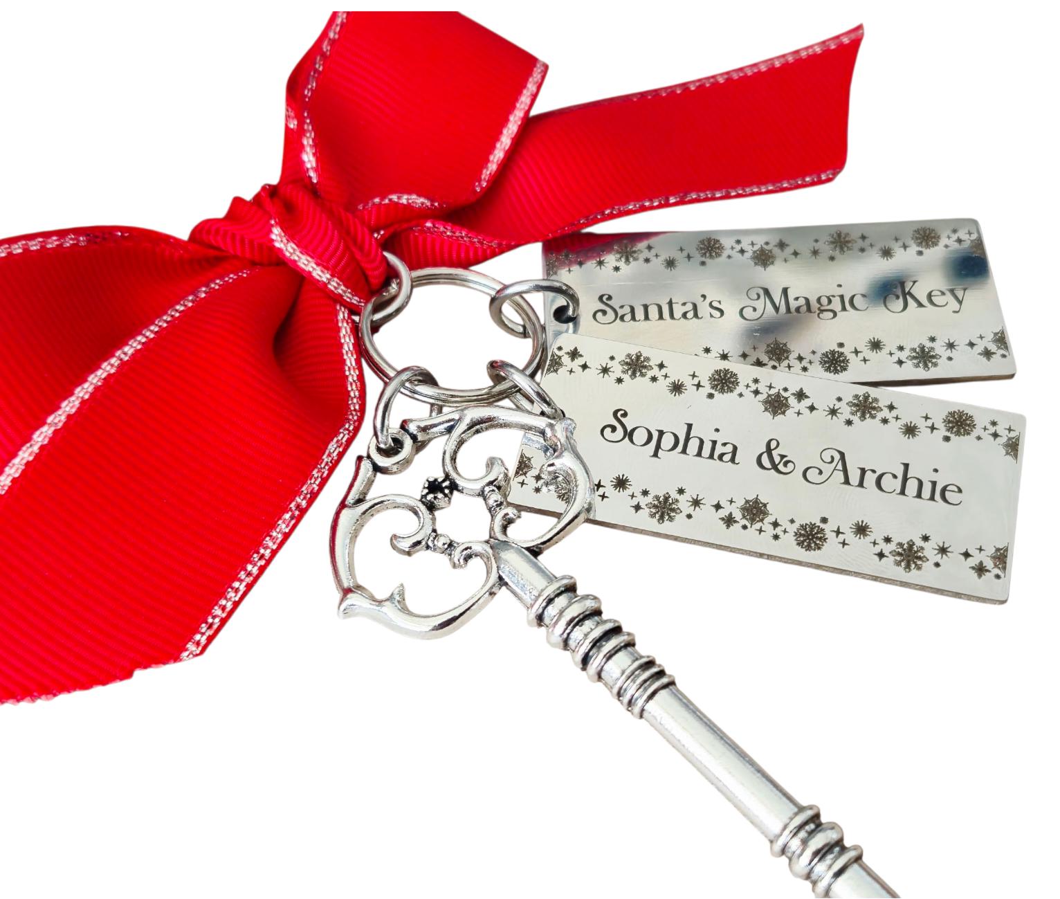 Each silver key comes tied with a festive red ribbon and two engraved stainless steel tags – one reading “Santa’s Magic Key” and the other personalised with your child’s or family name.
