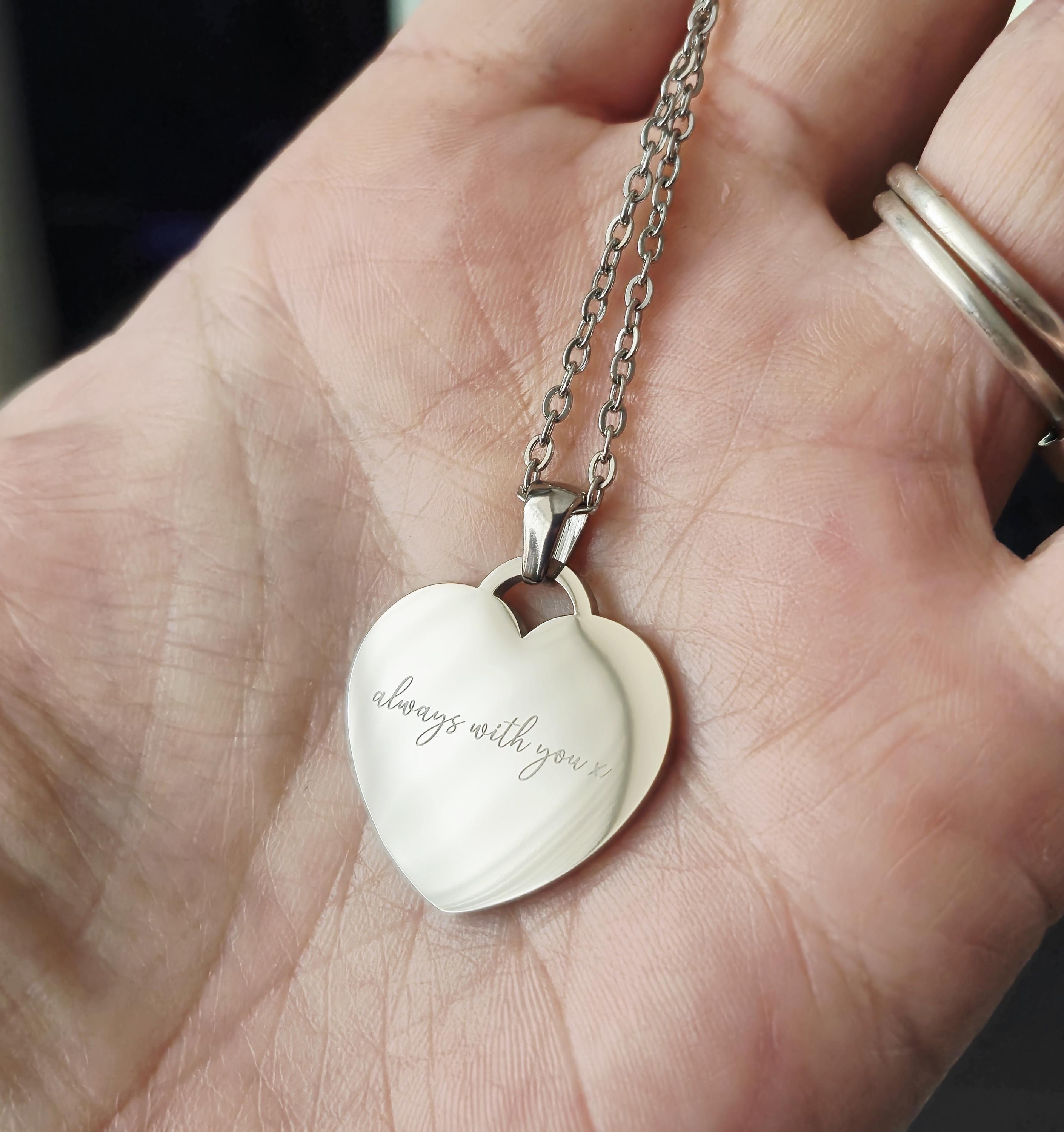 These beautiful stainless steel heart-lock necklaces make thoughtful, personalised gifts. Each piece can be engraved with your own text, and you’re welcome to add engraving on both the front and back.