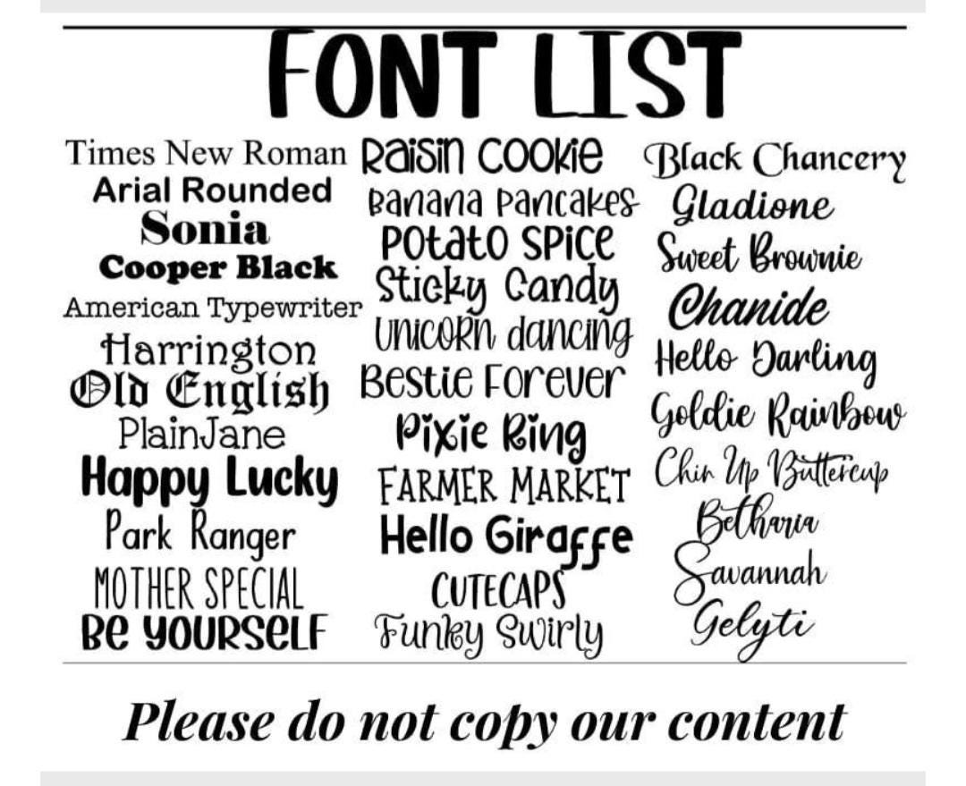 ☆☆☆If you do not state a font for the front we will use the one in the main photo sample for this listing☆☆☆