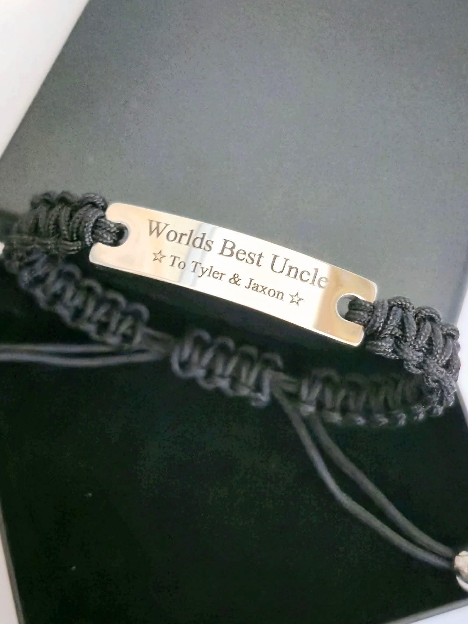 A stylish and meaningful keepsake for anyone special — this fully adjustable woven cord bracelet features a sleek stainless steel plate that can be engraved with any text, name, initials, date, or short message of your choice.